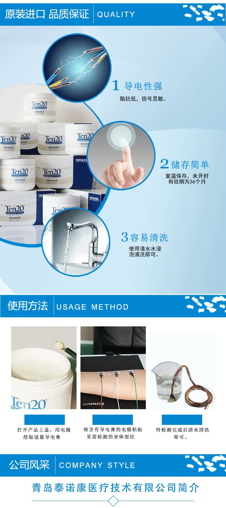| 作用機理 | Ten20導電膏純美國進口,具有良好的粘性和導電性。 粘性:防止檢測過程中電極脫落。 導電性:使傳輸電信號清晰、可辨。 易清洗:非油性配方使它易清洗,使用溫水即可清洗干凈。 使用方便:每盒3支(罐)裝。每個包裝有產(chǎn)品的有效期(3年)和原料的配方。 儲存:未開封36個月,室溫密閉保存即可,避免冷藏。 |