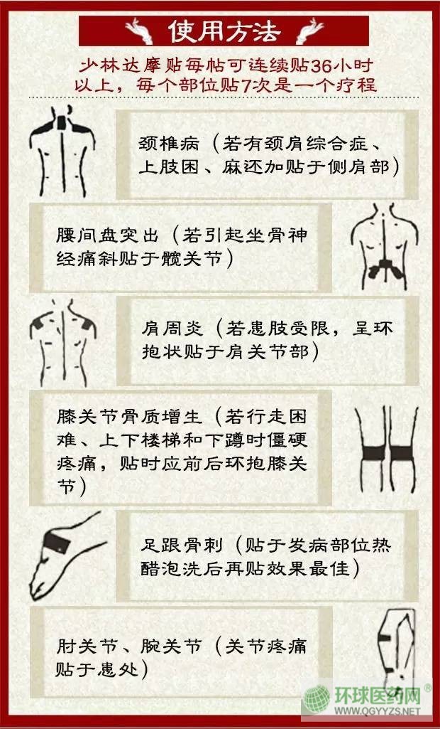 | 補(bǔ)充說(shuō)明 | 少林達(dá)摩貼,善于祛風(fēng)散寒除濕。少林達(dá)摩貼為純中藥制劑,對(duì)人體無(wú)害。少林達(dá)摩貼加以現(xiàn)代科技制作,方便貼用。 |