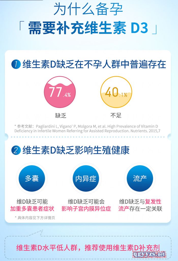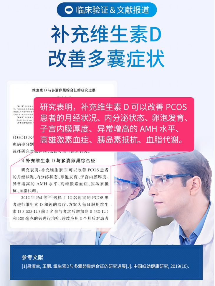 | 補(bǔ)充說(shuō)明 | 多囊卵巢綜合征的超重患者存在維生素D缺乏,連續(xù)補(bǔ)充維生素D 8周后,胰島素、甘油三酯和膽固醇水平**改善,連續(xù)補(bǔ)充維生素D 3個(gè)月后,**和血壓**降低;維生素D的缺乏,更容易產(chǎn)品抑郁情緒。提高維生素D水平,有助于降低抑郁風(fēng)險(xiǎn),保持更好的心態(tài)與情緒,從而提高妊娠率;多囊卵巢綜合征患者在連續(xù)三個(gè)月聯(lián)合服用維生素D和鈣后,月經(jīng)周期規(guī)律明顯改善,優(yōu)勢(shì)卵泡數(shù)明顯增加,在生殖治療過(guò)程中,維生素D與懷孕率相關(guān)。 |