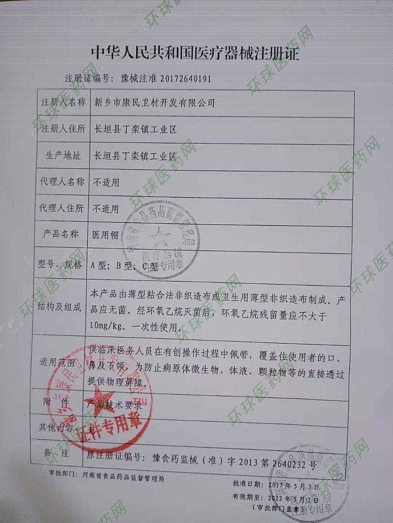 | 補(bǔ)充說(shuō)明 | 供臨床醫(yī)務(wù)人員在有創(chuàng)操作過(guò)程中佩戴,覆蓋住使用者頭部,為防止病原體微生物、體液、顆粒物等的直接透過(guò)提供物理屏障。 |