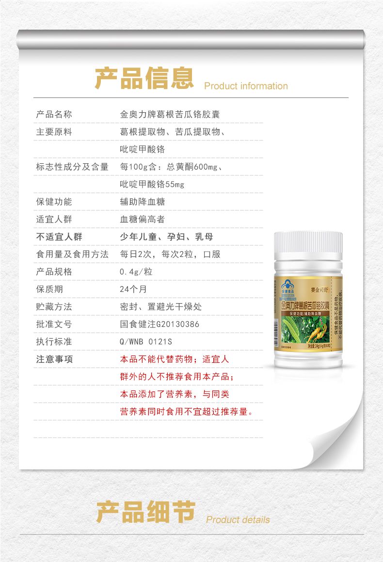 | 英文名稱 | Jin Ao Li Brand Kudzu Root Bitter Gourd Chromium Capsules |