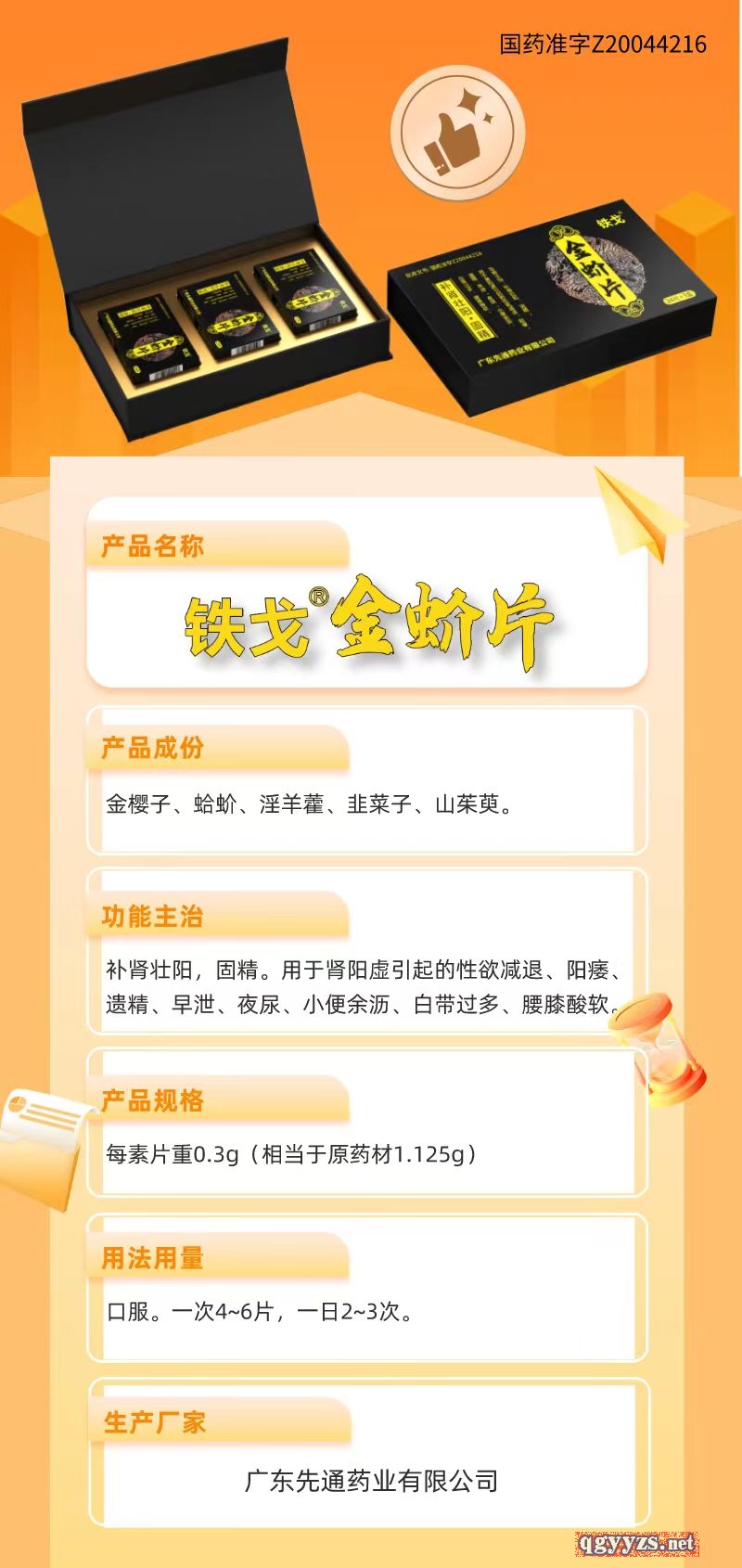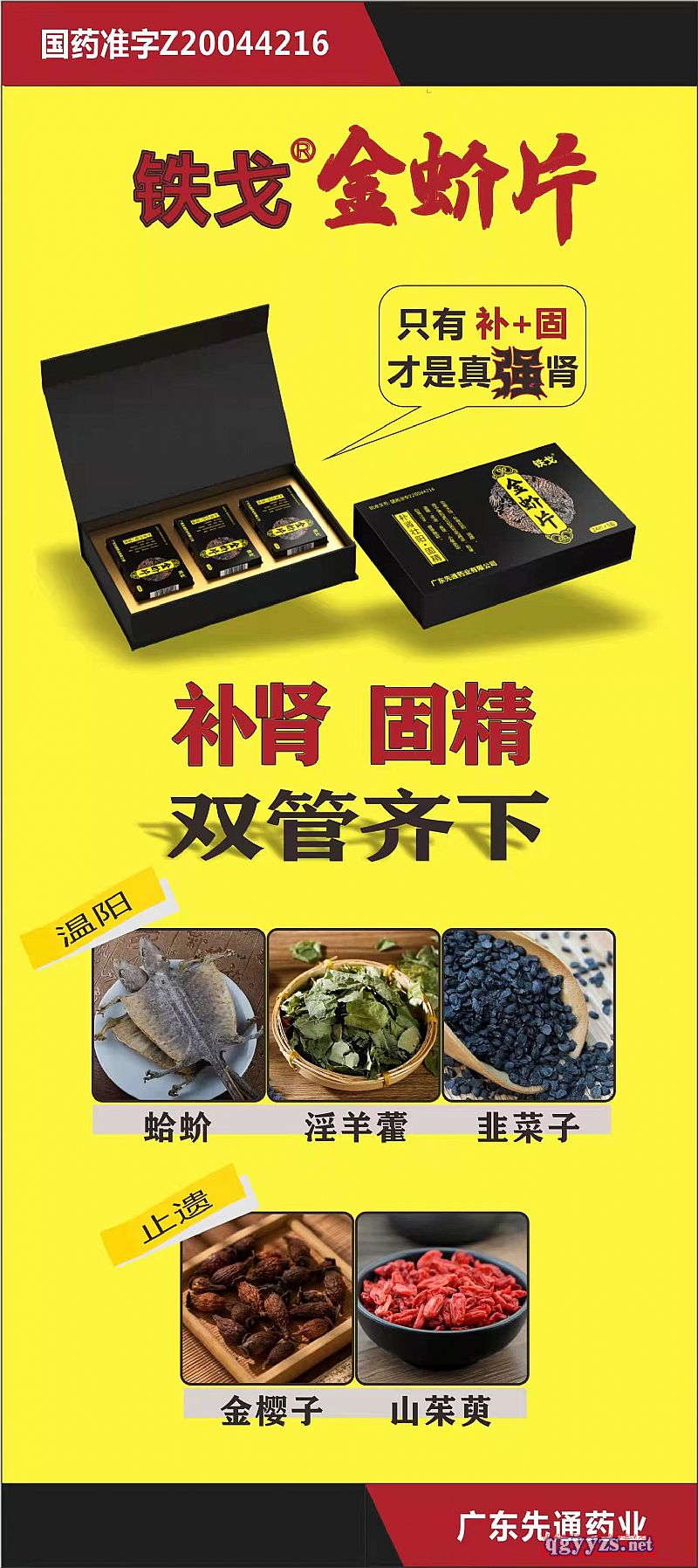 | 主要成分 | 金櫻子,蛤蚧,淫羊霍,韭菜子 |