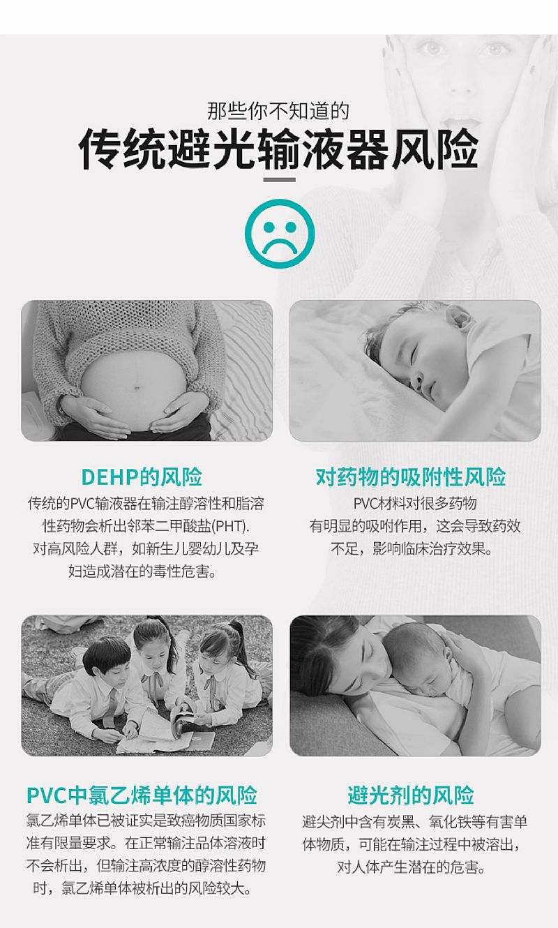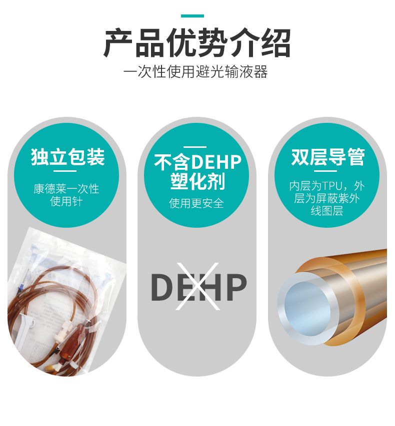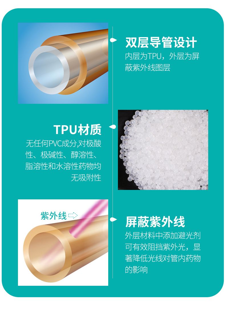 | 產(chǎn)品賣點(diǎn) | 1、運(yùn)用先進(jìn)的雙層導(dǎo)管復(fù)合工藝,內(nèi)層采用FDA推薦的聚氨酯(TPU)材料,不含DEHP,確保輸液**; 2、TPU與藥物相容性好,更具輸液**性;其主要用于制作人工心臟瓣膜、人工肺、人工血管/氣管、骨粘合劑、中心靜脈導(dǎo)管、高端輸液器等; 3、外層為避光層,無避光劑遷移、脫色問題,解決了避光劑遷移對(duì)藥液污染的問題; 4、避光率大; 5、管路彈性好,透明度高,易于觀察回血和液面。 |