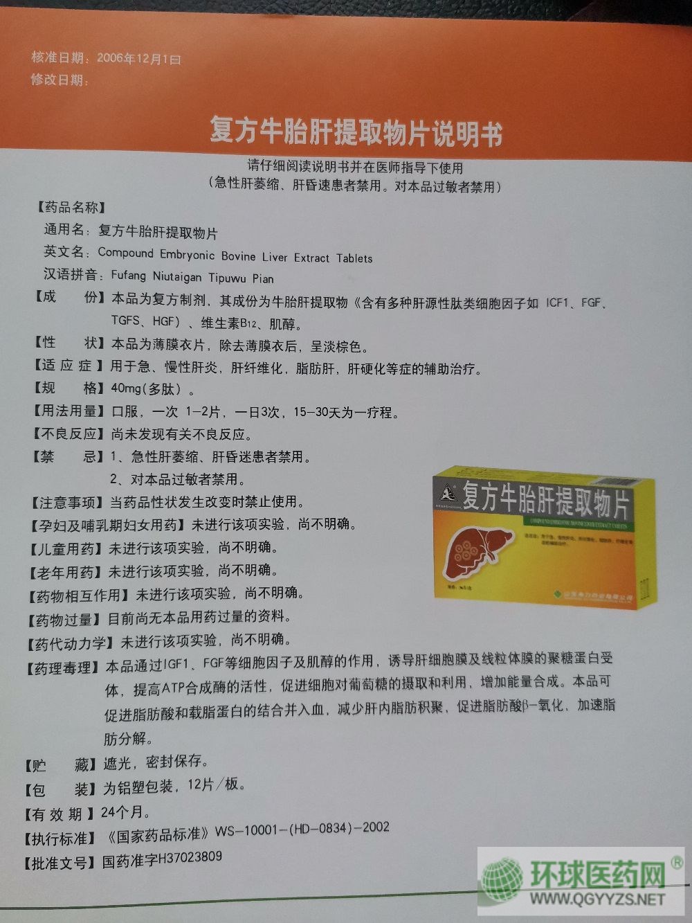 通用名稱: 復(fù)方牛胎肝提取物片