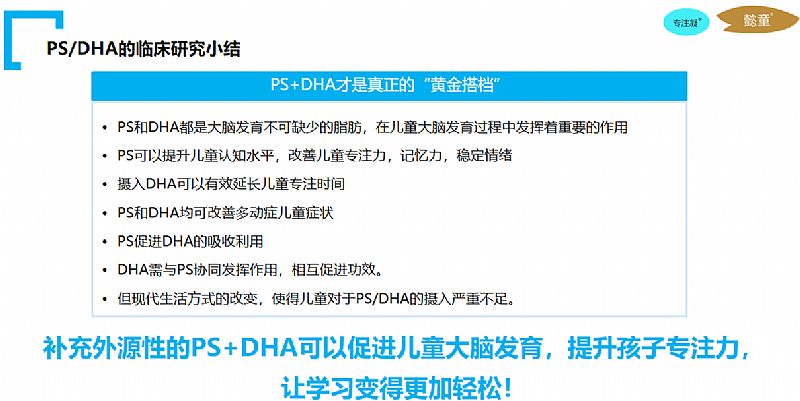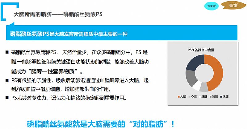 | 補(bǔ)充說明 | 磷脂酰絲氨酸簡稱PS,PS尤其對(duì)專注力、記憶力和情緒的穩(wěn)定起到重要作用。 DHA又稱二十二碳六稀酸(DHA),占了人腦脂肪的10%,對(duì)腦神經(jīng)傳導(dǎo)和突觸的生長發(fā)育極為有利優(yōu)先嵌入腦部和視網(wǎng)膜細(xì)胞膜內(nèi) 參與腦細(xì)胞形成和發(fā)育,維持神經(jīng)細(xì)胞正常生理活動(dòng) 對(duì)視網(wǎng)膜功能及將視覺刺激傳遞至腦部具有關(guān)鍵作用 DHA是維持大腦和視網(wǎng)膜功能正常的關(guān)鍵營養(yǎng)素! DHA也可以輔助改善多動(dòng)癥的癥狀 DHA可以延長注意力時(shí)長DHA也可以輔助改善多動(dòng)癥的癥狀 PS可以修復(fù)大腦,提高認(rèn)知能力,特別是學(xué)習(xí)和記憶能力 PS可以改善多動(dòng)癥ADHD癥狀 PS對(duì)改善短期聽覺記憶、注意力不集中和沖動(dòng)也同樣有效 PS/DHA**改善多種ADHD癥狀,提高生活品質(zhì) PS促進(jìn)DHA的吸收利用 DHA需與PS協(xié)同發(fā)揮作用,相互促進(jìn)功效 |
