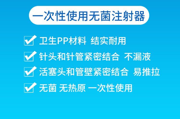 | 使用方法 | 2.1撕開(kāi)單包裝袋,取出注射器。 2.2去掉注射針保護(hù)套,拉動(dòng)芯桿作來(lái)回滑動(dòng),擰緊注射針,然后抽入藥液。 2.3注射針向上,緩慢上推芯桿排除空氣。 2.4進(jìn)行皮下或肌肉注射或進(jìn)行抽血。 |