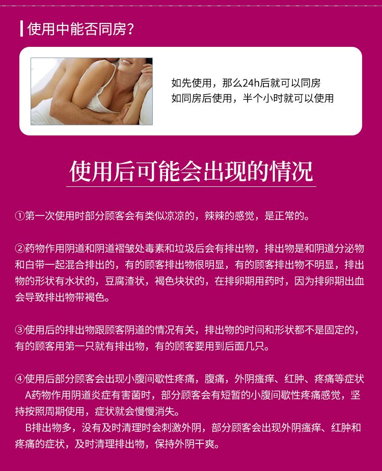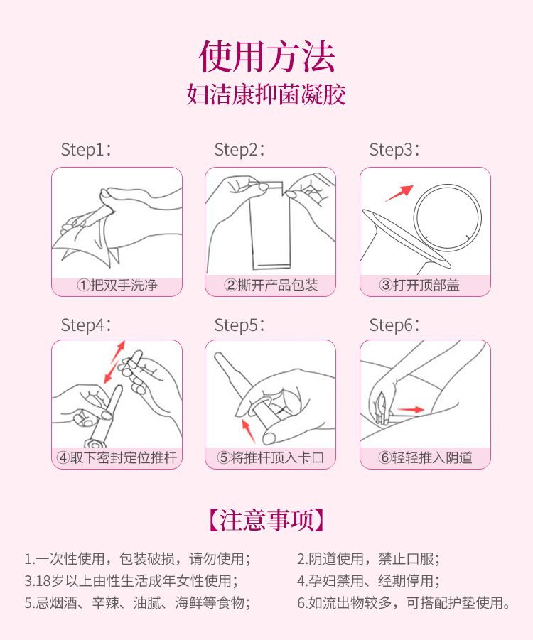 | 補充說明 | 1.一次性使用,包裝破損,請勿使用 2.陰道使用,禁止口服 3.18歲以上有性生活成年女性使用 4.孕婦禁用、經(jīng)期停用 5.忌煙酒、辛辣、油膩、海鮮等食物 6.如流出物較多,可搭配護(hù)墊使用 7.一般建議晚上使用,晚上睡覺前,將凝膠管插入陰道6-7cm深處,將凝膠保護(hù)改作為助推桿插入推進(jìn)器后端,身體平躺,把臀部略墊高,將藥慢慢推進(jìn)陰道后,拔出凝膠管,保持姿勢不動8-10分鐘。(一天一支) 8.月經(jīng)前3天和月經(jīng)期停止使用,月經(jīng)完全干凈后3天開始使用。 |