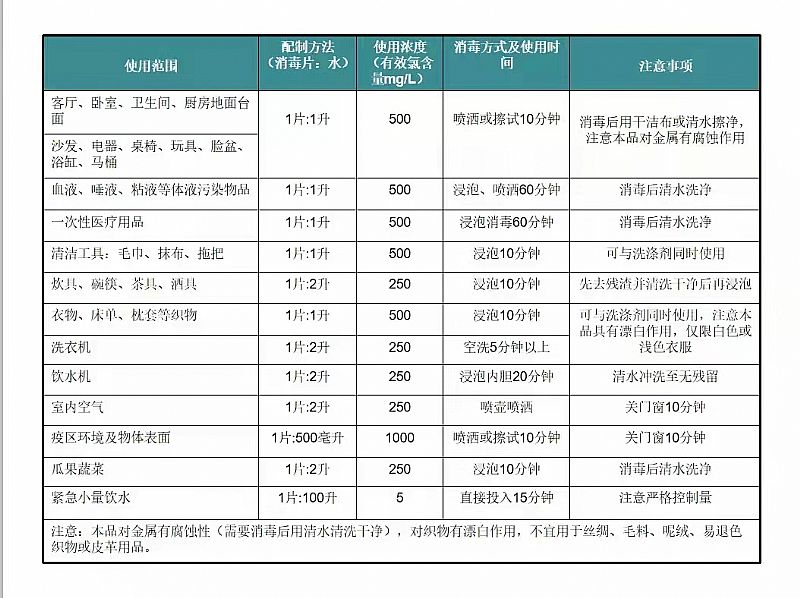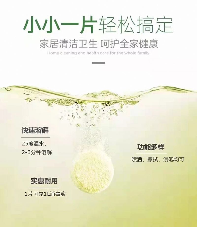 | 使用方法 | 第一步:取一片消毒片完全浸泡于水中第二步:具體不同情景使用方法如標(biāo)簽或說(shuō)明書(shū)所述 |