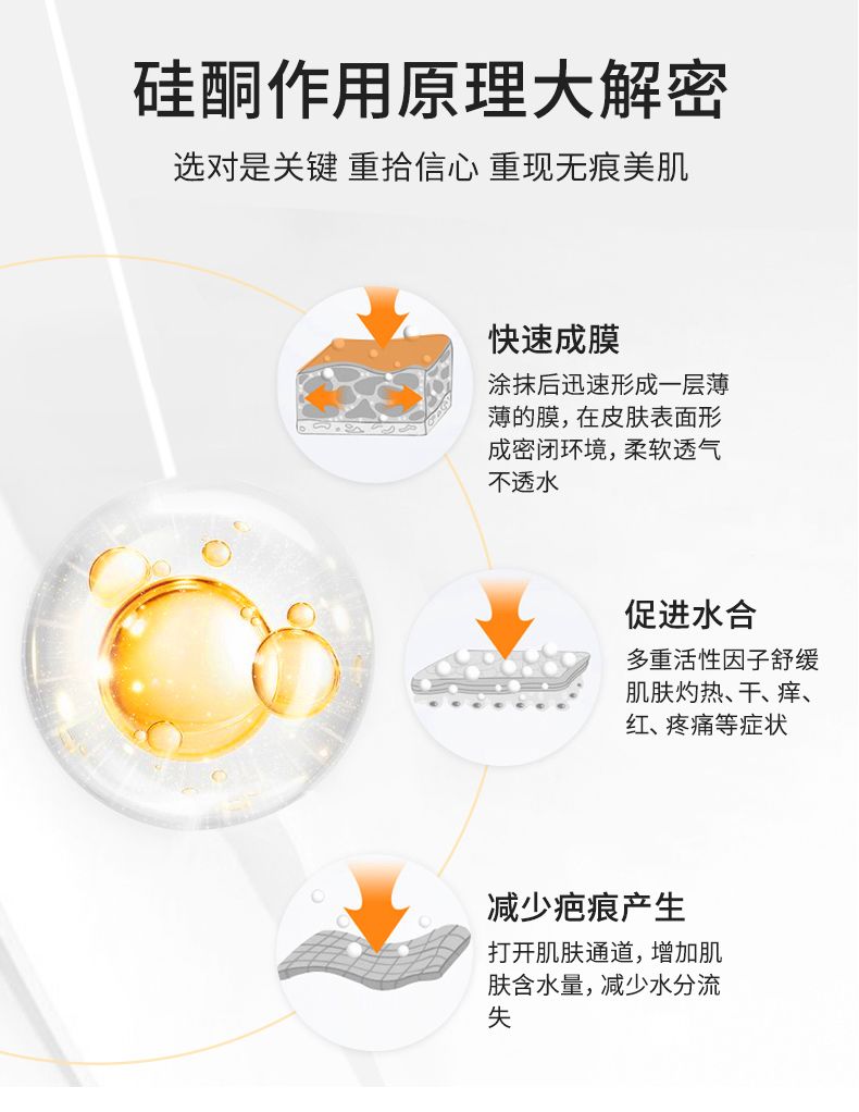| 補充說明 | 1、使用簡單方便:涂抹后在患處表面會迅速形成一層薄薄的硅膠膜,即時提供患處隱形硅酮接觸治療。 2、凝膠基質(zhì):透明凝膠質(zhì)地,易于涂抹,無油膩感,滋潤易吸收,溫和。 3、敏感肌可用:不添加激素,孕婦和兒童均可使用。 |