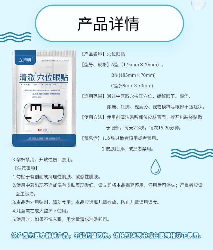 | 補(bǔ)充說(shuō)明 | 【產(chǎn)品名稱】穴位眼貼 【型號(hào)、規(guī)格】A型(175mm×70mm),B型(185mm×70mm),C型(58mm×70mm) 【結(jié)構(gòu)組成】該產(chǎn)品由無(wú)紡布、卡波姆、依地酸二鈉、純化水組成。 【適用范圍】通過(guò)中醫(yī)取穴按壓穴位,緩解眼干、眼澀、酸痛、紅腫、視疲勞、視物模糊等眼部不適癥狀。 【產(chǎn)品性能】pH4.5~7.0。 【使用方法】使用前清潔貼敷部位皮膚表面,撕開包裝袋貼敷于眼部,每天2-3次,每次15-20分鐘。 【禁 忌 癥】 1.皮膚過(guò)敏者慎用或者禁用。2.皮膚紅腫、破損者禁用。3.孕婦禁用、開放性傷口禁用。 【注意事項(xiàng)】 1.勿貼于有創(chuàng)面或病理性肌膚、敏感性肌膚。 2.使用中若出現(xiàn)不適或偶有皮膚表現(xiàn)發(fā)紅,請(qǐng)立即將本品揭棄停用,停用后可消失;嚴(yán)重者應(yīng)請(qǐng)醫(yī)生診治。 3.本品為外用貼劑,請(qǐng)勿食用;本品應(yīng)遠(yuǎn)離兒童存放,防止兒童誤用誤食。 4.兒童需在成人監(jiān)護(hù)下使用。 5.使用時(shí),如果不慎入眼,用大量清水沖洗即可。 【有效期】 二年 【生產(chǎn)日期/生產(chǎn)批號(hào)】 見外包裝 【貯存】通風(fēng)干燥處,避免陽(yáng)光直射。 【運(yùn)輸】產(chǎn)品在運(yùn)輸過(guò)程中應(yīng)避免日曬、雨淋及重壓。 【配件清單】穴位眼貼、說(shuō)明書 【生產(chǎn)許可證編號(hào)】晉食藥監(jiān)械生產(chǎn)許20200012號(hào) 【注冊(cè)證編號(hào)】晉械注準(zhǔn)20222140003 【產(chǎn)品技術(shù)要求編號(hào)】晉械注準(zhǔn)20222140003 【生產(chǎn)企業(yè)及售后服務(wù)單位】山西健康之路醫(yī)療器械有限公司 |