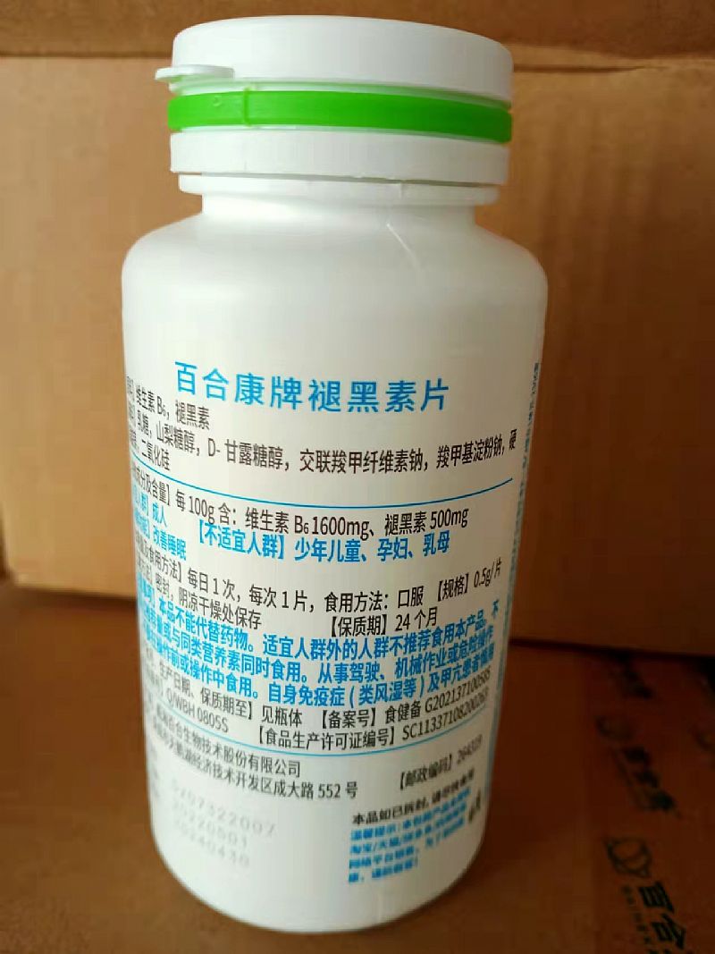 | 主要成分 | 褪黑素0.5g、維生素B61.60g主要原料褪黑素、維生素B6(鹽酸吡哆醇)、微晶纖維素、麥芽糊精、玉米淀粉、硬脂酸鎂 |