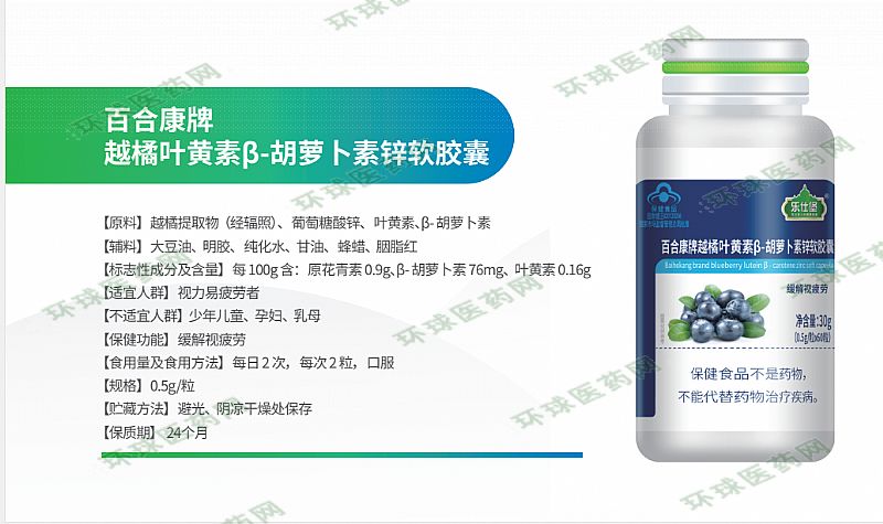 | 補(bǔ)充說明 | 原料】越橘提取物(經(jīng)輻照)、葡萄糖酸鋅、葉黃素、β-胡蘿卜素 【輔料】大豆油、明膠、純化水、甘油、蜂蠟、胭脂紅 【標(biāo)志性成分及含量】每100g含:原花青素0.9g、β-胡蘿卜素76mg、葉黃素0.16g 【適宜人群】視力易疲勞者 【不適宜人群】少年兒童、孕婦、乳母 【保健功能】緩解視疲勞 【食用量及食用方法】每日2次,每次2粒,口服 【規(guī)格】0.5g/粒 【貯藏方法】避光、陰涼干燥處保存 【保質(zhì)期】24個(gè)月 【注意事項(xiàng)】本品不能代替藥物;適宜人群外的人群不推薦食用本產(chǎn)品;本品添加了營(yíng)養(yǎng)素,與同類營(yíng)養(yǎng)素同時(shí)食用不宜超過推薦量 |