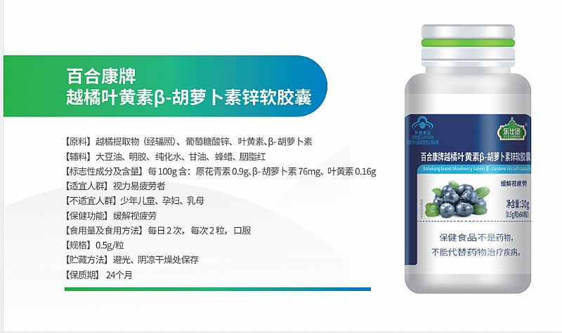 | 產(chǎn)品名稱 | 越橘葉黃素β-胡蘿卜素鋅軟膠囊 |