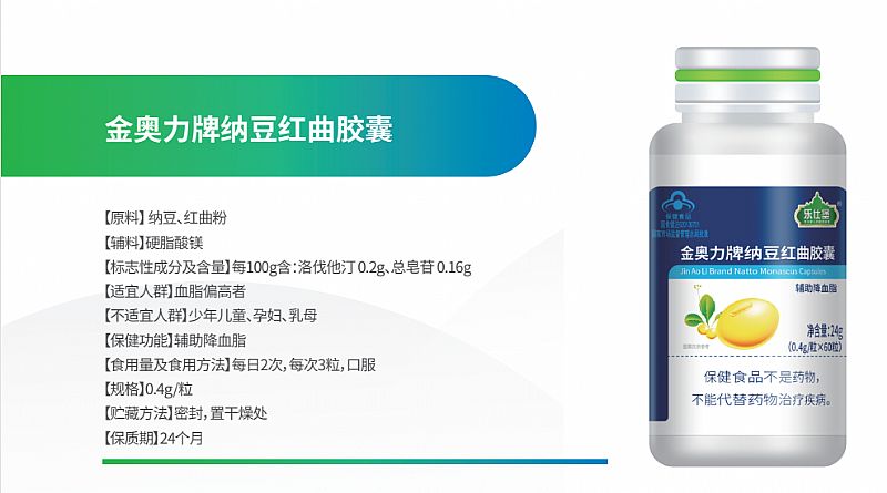 | 補(bǔ)充說(shuō)明 | 保健功能:輔助降血脂 功效成分/標(biāo)志性成分含量:每100g含:洛伐他汀 0.2g、總皂苷 0.25g 主要原料:紅曲、納豆、硬脂酸鎂 適宜人群:血脂偏高者 不適宜人群:少年兒童、孕婦、乳母 食用方法及食用量:每日2次,每次3粒,口服 產(chǎn)品規(guī)格:0.4g/粒 保質(zhì)期:24個(gè)月 貯藏方法:密封,置干燥處 注意事項(xiàng):本品不能代替藥物;不宜與他汀類藥物同時(shí)使用 批準(zhǔn)文號(hào):國(guó)食健字G20130751 |