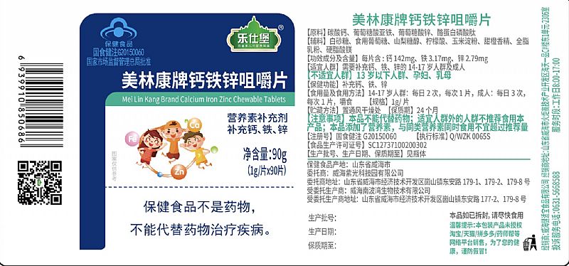 | 英文名稱 | Mei Lin Kang Brand Calcium ron Zinc Chewable Tablets |