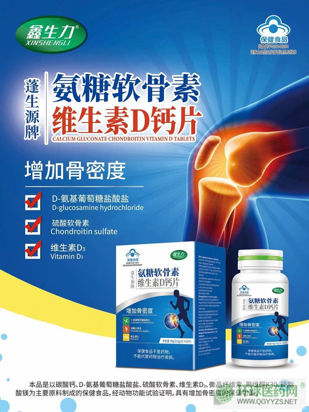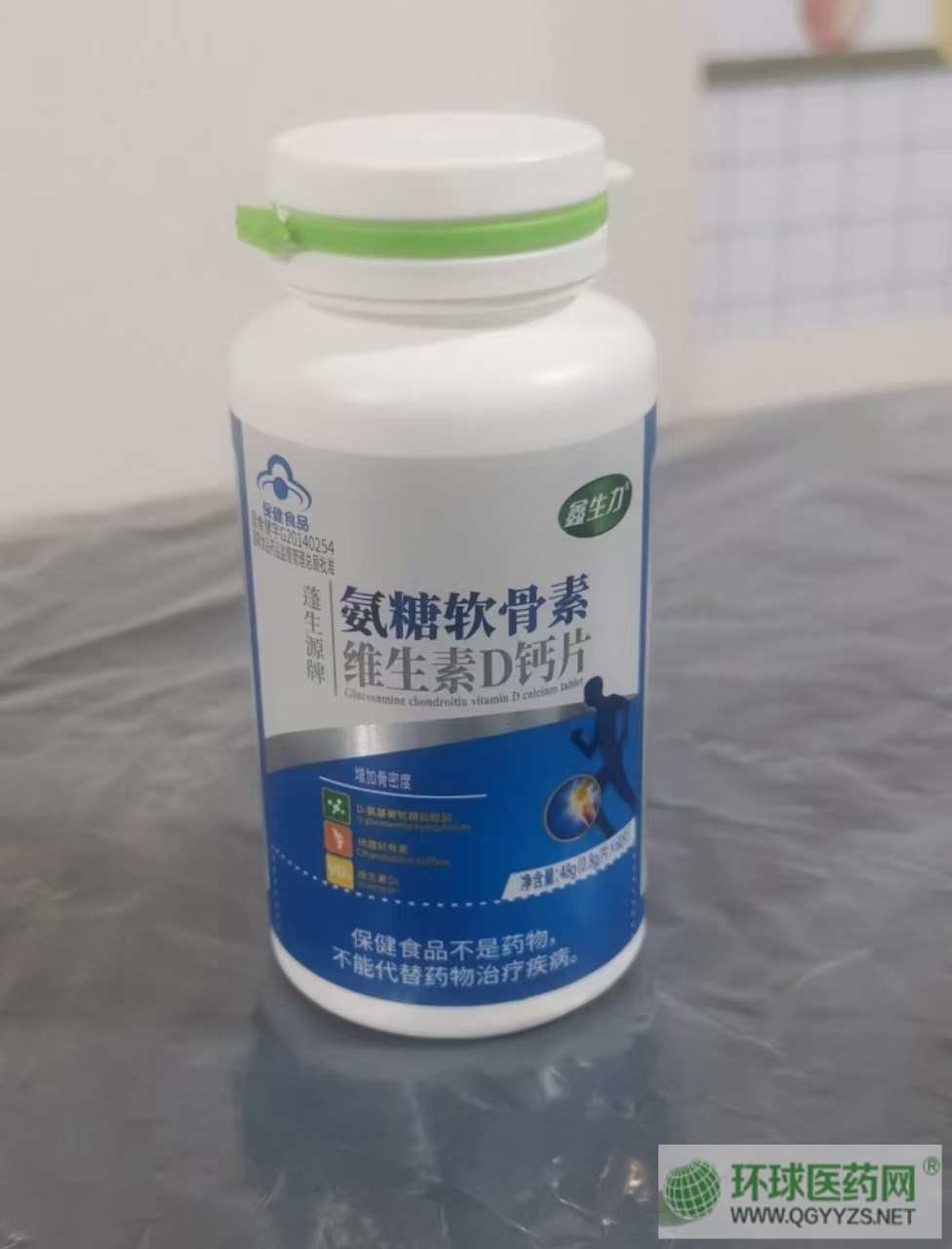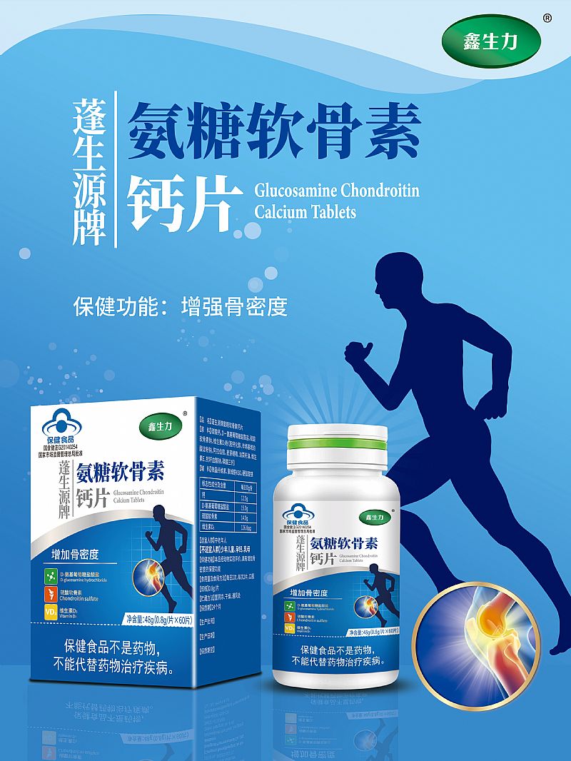 | 主要成分 | 每100g含:鈣16.84g、D-氨基葡萄糖鹽酸鹽18.1g、硫酸軟骨素16.7g、維生素D:165.55ug |