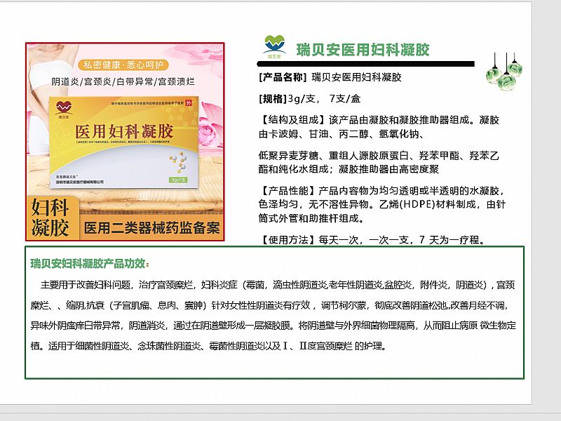 | 產(chǎn)品用途 | 用于陰道炎宮頸炎白帶異常宮頸潰爛,通過陰道壁形成凝膠膜,將陰道壁與外界細菌物理隔離,從而阻止病原微生物定值 適用于細菌性陰道炎,念珠菌陰道炎,霉菌性陰道炎,以及12度宮頸糜爛的護理 |