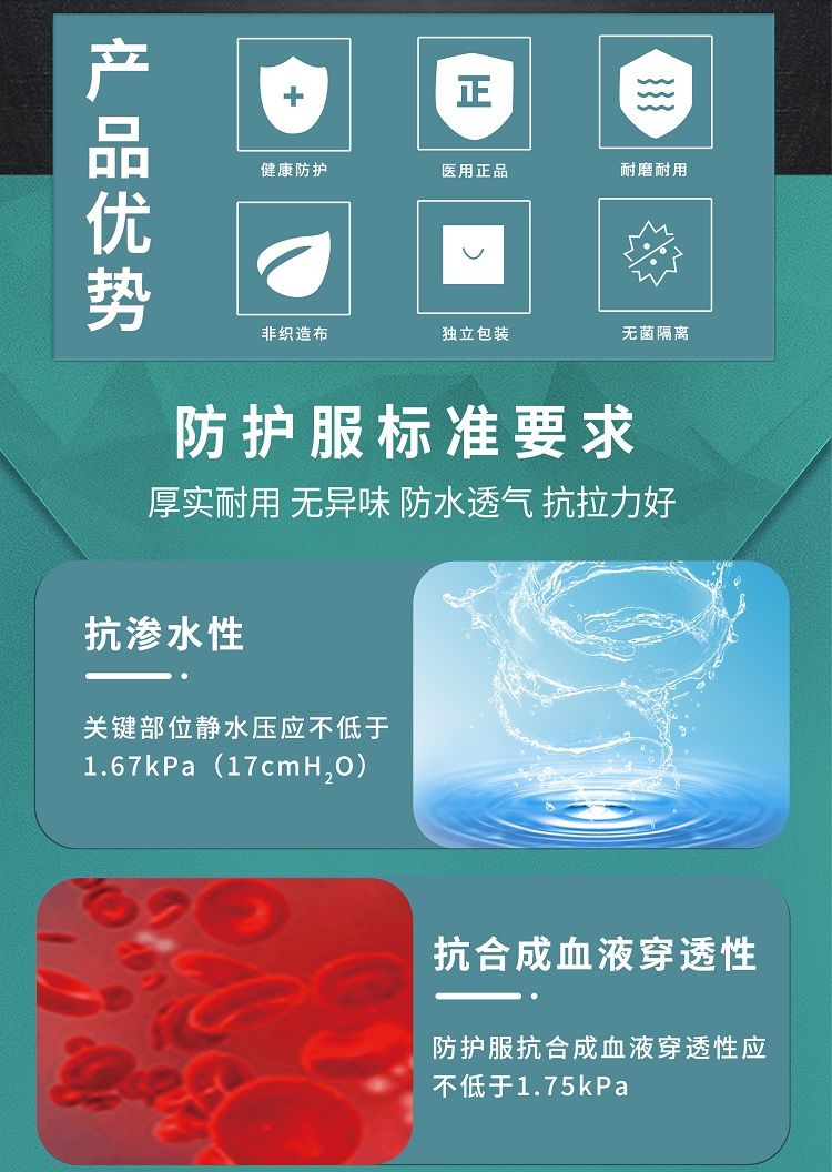 | 作用機(jī)理 | 由SMS無紡布和PP+PE覆膜材料組成,用于臨床醫(yī)務(wù)人員在工作時(shí)接觸到的具有潛在感染性的患者血液、體液、分泌物等阻隔、防護(hù)。 |