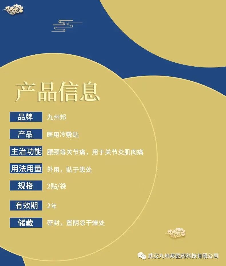 | 使用方法 | 根據(jù)中醫(yī)穴位療法,按不同癥狀(肩周炎、頸椎病、腰椎間盤(pán)突出、關(guān)節(jié)炎等)引起的 疼痛部位清潔擦干后,揭掉貼片上的離型紙,貼于患處,根據(jù)貼敷部位可貼敷12-72小時(shí)。 |