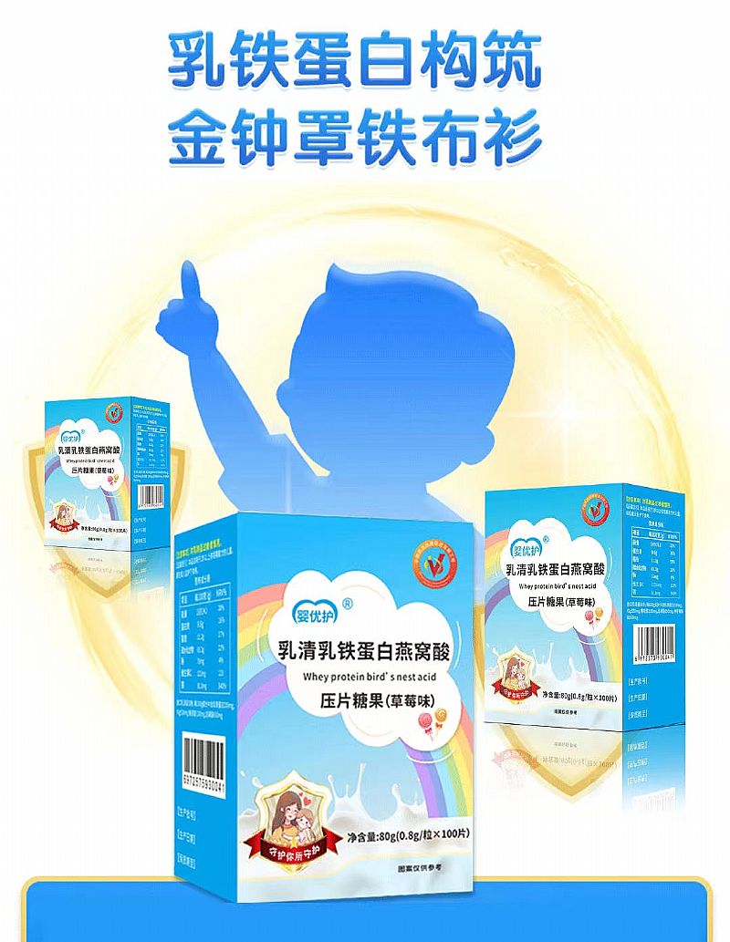 | 產(chǎn)品名稱 | 嬰優(yōu)護(hù)牌乳清乳鐵蛋白燕窩酸壓片糖果 |