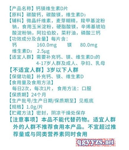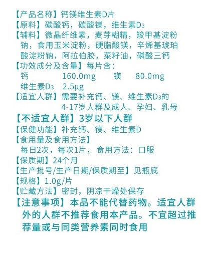 | 作用機(jī)理 | 【適宜人群】需要補充鈣、鎂、維生素D3的4-17歲人群及成人、孕婦、乳母 【不適宜人群】3歲以下人群 【保健功能】補充鈣、鎂、維生素D |