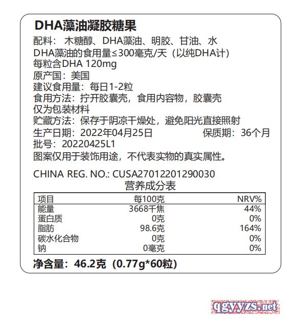 | 補(bǔ)充說明 | 美國原裝進(jìn)口DHA藻油 產(chǎn)品名稱:DHA藻油凝膠糖果 配料: 木糖醇、DHA藻油、明膠、甘油、水 DHA藻油的食用量≤300毫克/天(以純DHA計) 每粒含DHA 120mg 原產(chǎn)國:美國 建議食用量:每日1-2粒 食用方法:擰開膠囊殼,食用內(nèi)容物,膠囊殼 僅為包裝材料 貯藏方法:保存于陰涼干燥處,避免陽光直接照射 保質(zhì)期:36個月 批號:20220425L1 圖案僅用于裝飾用途,不代表實物的真實屬性。 CHINA REG. NO.: CUSA27012201290030 營養(yǎng)成分表 項目 每100克 NRV% 能量 3668千焦 44% 蛋白質(zhì) 0克 0% 脂肪 98.6克 164% 碳水化合物 0克 0% 鈉 0毫克 0% 凈含量:46.2克(0.77g*60粒) 美國原裝進(jìn)口DHA藻油由美國原裝進(jìn)口。 |