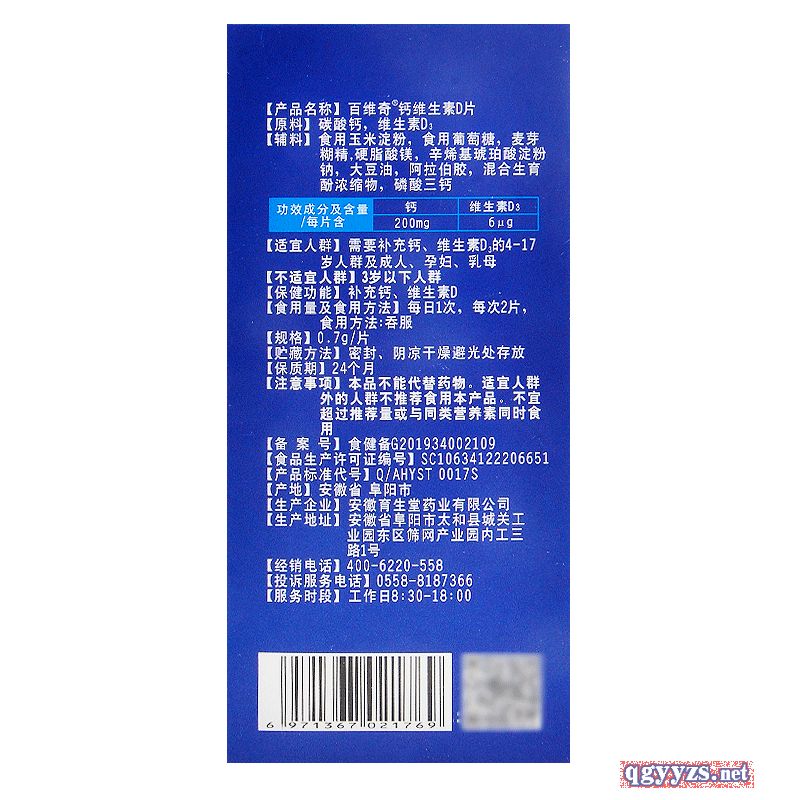 | 補充說明 | 申請人***稱:安徽育生堂藥業(yè)有限公司 功效成分/標志性 成分含量:每片含:鈣200mg 維生素D3 6μg 不適宜人群:3歲以下人群 貯藏方法:密封、陰涼干燥避光處存放 主要原料:碳酸鈣,維生素D3 批準文號:食健備G201934002109 產(chǎn)品標準號:SC10634122206651 廠名:安徽育生堂藥業(yè)有限公司 廠址:安徽省阜陽市太和縣城關工業(yè)園東區(qū)篩網(wǎng)產(chǎn)業(yè)園內(nèi) 保質(zhì)期:730天 產(chǎn)品名稱:百維奇?鈣維生素D 食用方法和食用量:每日1次,每次2片, 食用方法:吞服 注意事項:本品不能代替藥物。適宜人群外的人群不推薦食用本產(chǎn)品。不宜超過推薦量或與同類營養(yǎng)素同時食用 |