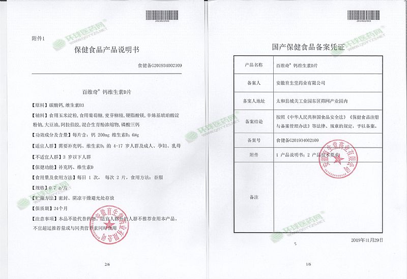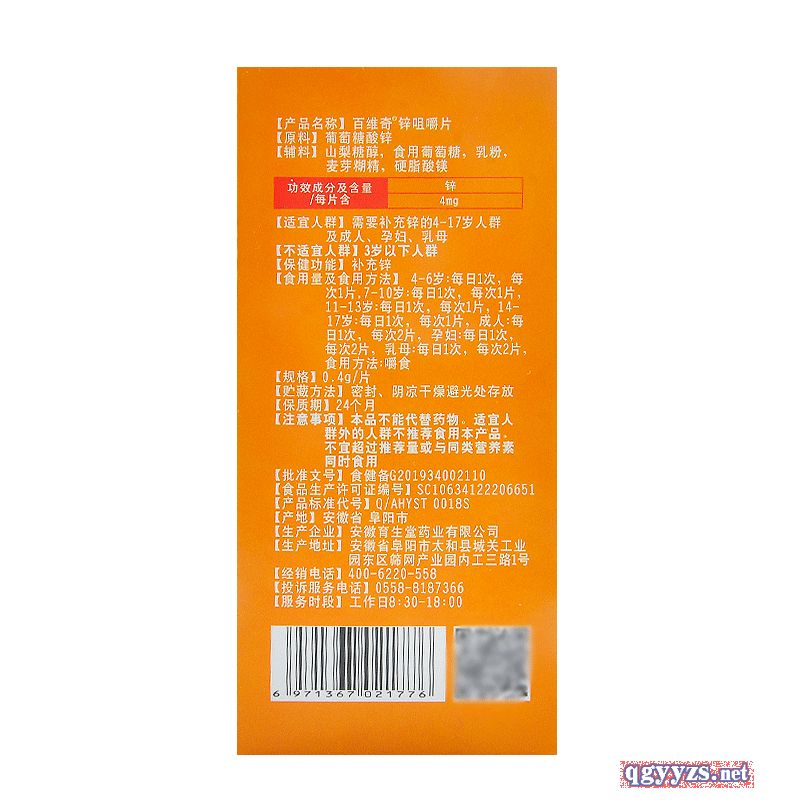 | 補充說明 | 申請人***稱:安徽育生堂藥業(yè)有限公司 功效成分/標志性成分 含量:每片含 4mg 鋅 不適宜人群:3歲以下人群 貯藏方法:密封 陰涼干燥避光處存放主要 原料:葡萄糖酸鋅 批準文號:食健備G201934002110 產(chǎn)品標準號:SC10634122206651 廠名:安徽育生堂藥業(yè)有限公司 廠址:安徽省阜陽市太和縣城關(guān)工業(yè)園東區(qū)篩網(wǎng)產(chǎn)業(yè)園內(nèi) 保質(zhì)期:730天 具體規(guī)格:0.4g/片*90片 是否進口:否 產(chǎn)品劑型:片劑保健食品 產(chǎn)品名稱:百維奇鋅咀嚼片 是否禮盒裝:否 注意事項:本品不能代替藥物。適宜人群外的人群不推薦食用本產(chǎn)品。不宜超過推薦量或與同類營養(yǎng)素同時食用。 |