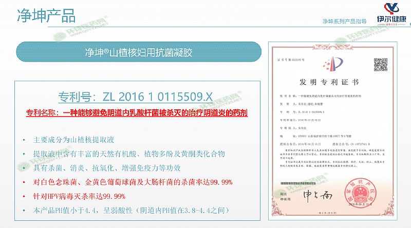 | 其它說(shuō)明 | 本產(chǎn)品由2019年獲得的國(guó)家發(fā)明專利轉(zhuǎn)化而來(lái),專利名稱:―種能夠避免陰道內(nèi)乳桿菌被殺滅的治療陰道炎的藥劑。專利號(hào):ZL 2016 1 0115509.x 本產(chǎn)品獨(dú)有的六大優(yōu)勢(shì) 一、植物成分(不含任何激素類、化學(xué)合成類抗生素) 二、***高(2分鐘內(nèi)殺菌99.38%) 三、靶向殺菌(殺滅有害菌、保留有益菌) 四、促進(jìn)乳酸桿菌生長(zhǎng)、增強(qiáng)自身免疫功能 五、Ph值<4.4 六、抗HPV病毒(殺滅率99.99%) |