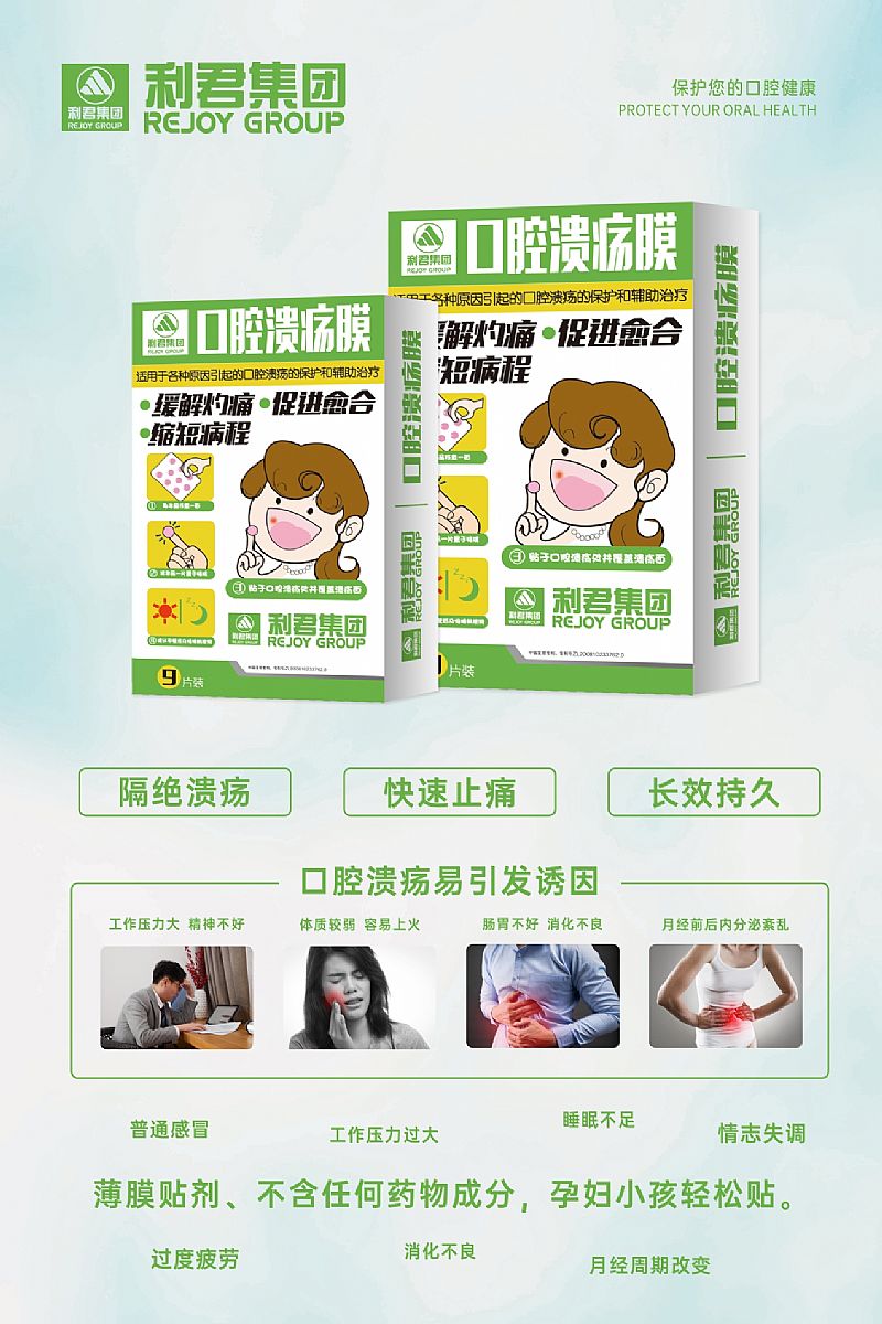 | 補(bǔ)充說明 | 1、本品能夠粘附、覆蓋于口腔潰瘍面,并在一定時(shí)間內(nèi)保持膜完整性,起保護(hù)口腔潰瘍的作用。 2、本品能減少食物、飲水、唾液對口腔潰瘍面的刺激,迅速緩解口腔潰瘍的灼痛感。不掛網(wǎng);控銷; |