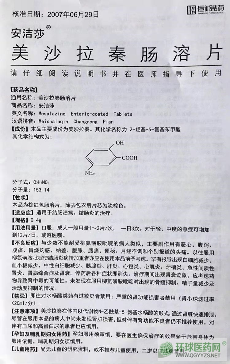 | 通用名稱 | 美沙拉秦腸溶片 |