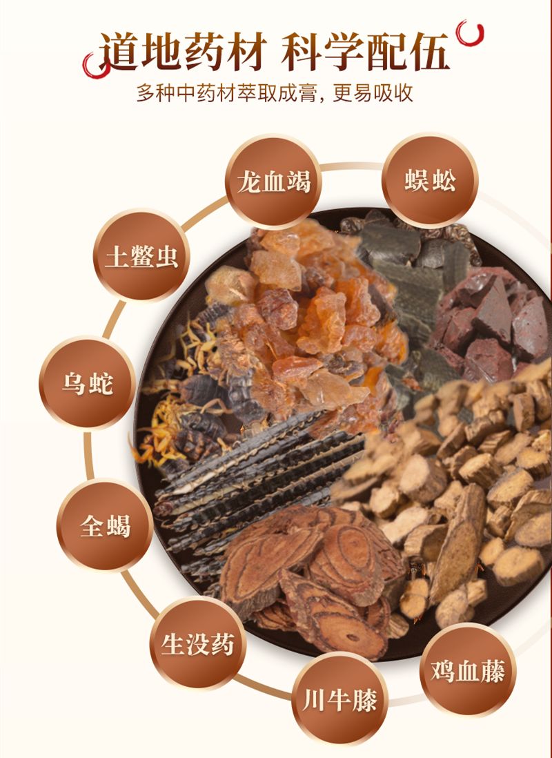 | 主要成分 | 本品是以龍血竭、烏蛇、細辛、蜈蚣、全蝎、土鱉蟲、肉桂、生乳香、生沒藥、牛角粉、樟腦、冰片、三七粉、威靈仙、七葉一枝花、桂枝、雞血藤、紅花、當(dāng)歸、川芎、生地、羌活、獨活、蓁艽、防風(fēng)、三棱、莪術(shù)、透骨草、木瓜、伸筋草、尋骨風(fēng)、干姜、急性子、川牛膝、九里香為主要原料,經(jīng)特定工藝加工而成。 |