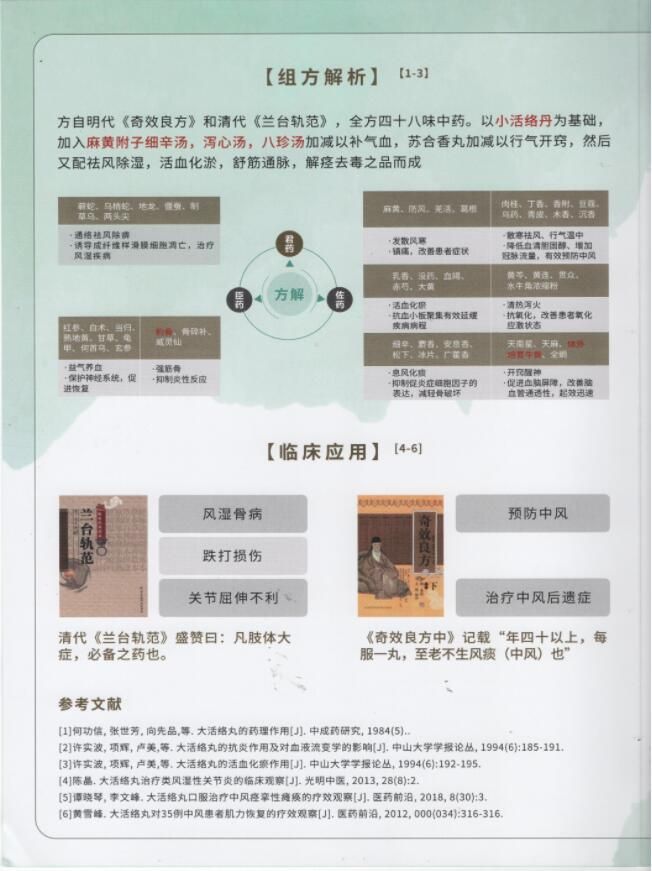 | 功能主治 | 祛風(fēng)止痛,除濕豁痰,舒筋活絡(luò)。用于中風(fēng)痰厥引起的癱瘓,足萎痹痛,筋脈拘急,腰腿疼痛及跌打損傷,行走不便,胸痹等癥。中風(fēng)(缺血性中風(fēng))痹病(風(fēng)濕性關(guān)節(jié)炎、骨關(guān)節(jié)炎),中風(fēng)、痹病、胸痹、跌打損傷,中風(fēng)痰厥,中風(fēng)后遺癥,類風(fēng)濕關(guān)節(jié)炎,腦梗死證屬風(fēng)痰瘀阻,冠心病心絞痛. |