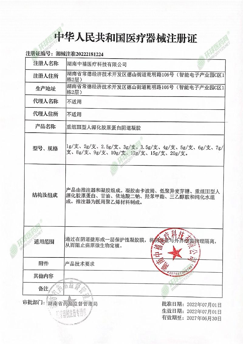| 補(bǔ)充說明 | 重組III型人源化膠原蛋白陰道凝膠產(chǎn)品說明書 請仔細(xì)閱讀說明書并按說明使用或在醫(yī)師指導(dǎo)下使用 【產(chǎn)品名稱】重組III型人源化膠原蛋白陰道凝膠 【型號規(guī)格】1g/支、2g/支、2.5g/支、3g/支、3.5g/支、4g/支、5g/支、6g/支、7g/支、8g/支、9g/支、10g/支、12g/支、15g/支、20g/支。 【產(chǎn)品性能】推注器表面應(yīng)光滑,無鋒棱、無毛刺,外形應(yīng)無明顯變形。凝膠應(yīng)為無色至棕色,無肉眼可見異物、無雜質(zhì)。其他詳見產(chǎn)品技術(shù)要求。 【結(jié)構(gòu)及組成】產(chǎn)品由推注器和凝膠組成。凝膠由卡波姆、低聚異麥芽糖、重組Ⅲ型人源化膠原蛋白、甘油、依地酸二鈉、羥苯甲酯、三乙醇胺和純化水組成。推注器為醫(yī)用聚乙烯材料制成。 【作用機(jī)理】產(chǎn)品中低聚異麥芽糖具有雙歧桿菌增殖作用而調(diào)節(jié)陰道生態(tài)平衡;重組Ⅲ型人源化膠原蛋白具有保濕鎖水、修護(hù)肌膚和促進(jìn)細(xì)胞生長作用;甘油具有保濕潤燥作用;通過三乙醇胺堿中和后的卡波姆具有良好的成膜、粘附和凝膠基質(zhì)效應(yīng)起保護(hù)和鎖水修復(fù)作用;依地酸二鈉起螯合、穩(wěn)定、抗氧抗腐和維持酸堿平衡的作用。產(chǎn)品通過在宮頸和陰道壁形成一層保護(hù)性凝膠膜,將宮頸和陰道壁與外界細(xì)菌物理隔離,從而阻止病原微生物定植,降低病原微生物感染,從而達(dá)到預(yù)期用途。 【適用范圍】通過在陰道壁形成一層保護(hù)性凝膠膜。將陰道壁與外界細(xì)菌物理隔離,從而阻止病原微生物定植。 【使用方法】 1.打開包裝取下保護(hù)帽;2.將推注器輕輕插入陰道深處,利用助推桿將凝膠推入至宮頸處;3.每天1支。14天為一個(gè)療程。 【禁 忌 癥】經(jīng)期、孕期停用。處女和對本品過敏者禁用。 【注意事項(xiàng)、警示及提示性說明】 1.本品僅供外用,請勿內(nèi)服;廢棄物請按當(dāng)?shù)丨h(huán)保要求處理。 2.本產(chǎn)品為一次性使用,開封即用。使用前,請認(rèn)真閱讀說明書。 3.使用前清潔雙手和陰道,保持清潔衛(wèi)生。 4.請?jiān)诋a(chǎn)品有效期內(nèi)使用,包裝破損或性狀發(fā)生改變時(shí)禁止使用。 5.由于有少量流出物,建議與衛(wèi)生護(hù)墊合用;若有流出擦凈即可。 6.請將本品放在兒童不能接觸的地方。 7.本產(chǎn)品連續(xù)累計(jì)使用時(shí)間不超過24h。 【貯存條件】密封,在常溫處貯存。 【生產(chǎn)批號】、【生產(chǎn)日期】詳見產(chǎn)品包裝標(biāo)識(shí)。 【有效期限】 二年。 【醫(yī)療器械注冊證號】湘械注準(zhǔn)20222181224 【醫(yī)療器械生產(chǎn)企業(yè)許可證號】湘藥監(jiān)械生產(chǎn)許20220128號 【產(chǎn)品技術(shù)要求編號】湘械注準(zhǔn)20222181224 【注冊人/生產(chǎn)企業(yè)名稱】 湖南中禧醫(yī)療科技有限公司 【售后服務(wù)單位】 湖南中禧醫(yī)療科技有限公司 【注冊人住所/生產(chǎn)地址】 湖南省常德經(jīng)濟(jì)技術(shù)開發(fā)區(qū)德山街道乾明路106號(智能電子產(chǎn)業(yè)園C區(qū)1棟2層) 【郵政編碼】415001 【聯(lián)系方式】 電話號碼:400-0816885 【說明書編制/修改日期】2022年05月16日編制 版本號A/1。 |