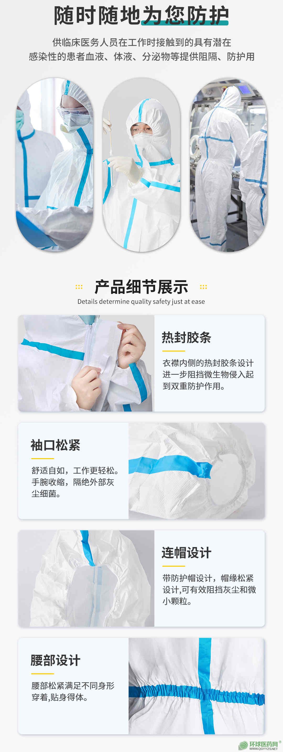 | 產品賣點 | 連體防護服獨立包裝,帶帽連體衣、防液體飛沫、醫(yī)用滅菌、透氣防水。 |