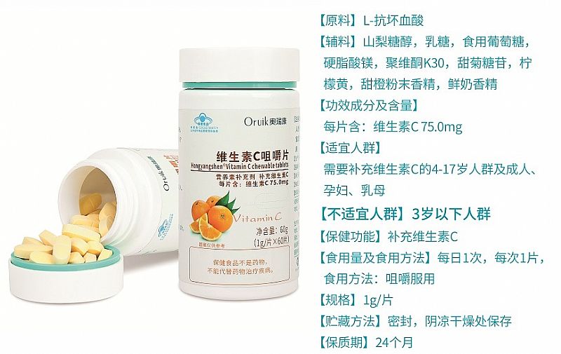 | 主要成分 | 【原料】L-抗壞血酸 【輔料】山梨糖醇,乳糖,食用葡萄糖,硬脂酸鎂,聚維酮K30,甜菊糖苷,檸檬黃,甜橙粉末香精,鮮奶香精 【功效成分及含量】 每片含:維生素C75.0mg |