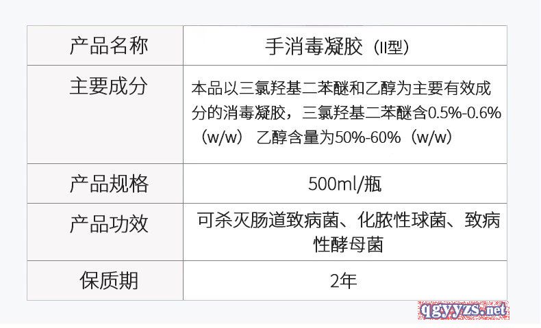 | 主要成分 | 本品是以三氯羥基二苯醚和乙醇為主要有效成分的消毒凝膠,三氯羥基二苯醚含量為0.5%-0.6%(w/w)乙醇含量為50%-60%(w/w) |
