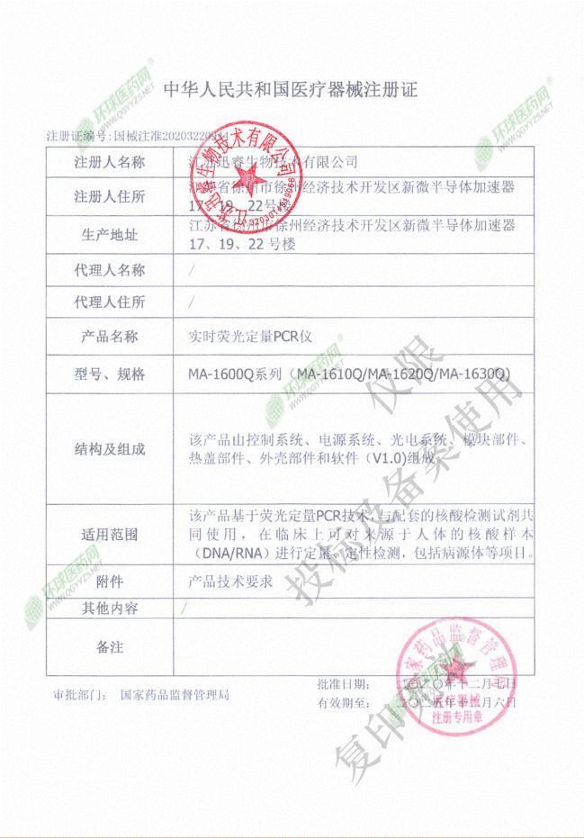 | 補(bǔ)充說明 | 注冊證號(hào) 國械注準(zhǔn)20203220944 適用范圍 該產(chǎn)品基于熒光定量PCR技術(shù),與配套的核酸檢測試劑共同使用,在臨床上可對來源于人體的核酸樣本(DNA/RNA)進(jìn)行定量、定性檢測,包括病源體等項(xiàng)目。 結(jié)構(gòu)及組成 型號(hào)MA-1610Q、型號(hào)MA-1620Q和型號(hào)MA-1630Q由控制系統(tǒng)、電源系統(tǒng)、光電系統(tǒng)、模塊部件、熱蓋部件、外殼部件和軟件(版本號(hào):V1.0)組成;型號(hào)MA-1640Q由控制系統(tǒng)、電源系統(tǒng)、光電系統(tǒng)、模塊部件、熱蓋部件、外殼部件、軟件V1.0和PC端軟件(版本號(hào)V1.0)組成 注冊信息 |