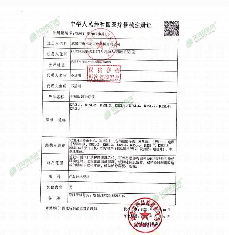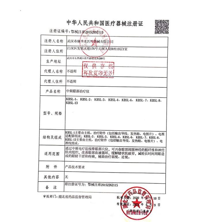 | 英文名稱 | Kangbenlong Intermediate Frequency Eye Treatment Instrument KBSL-1 |