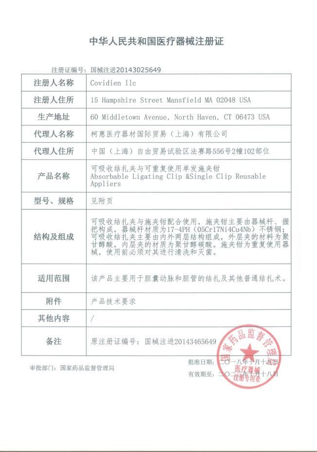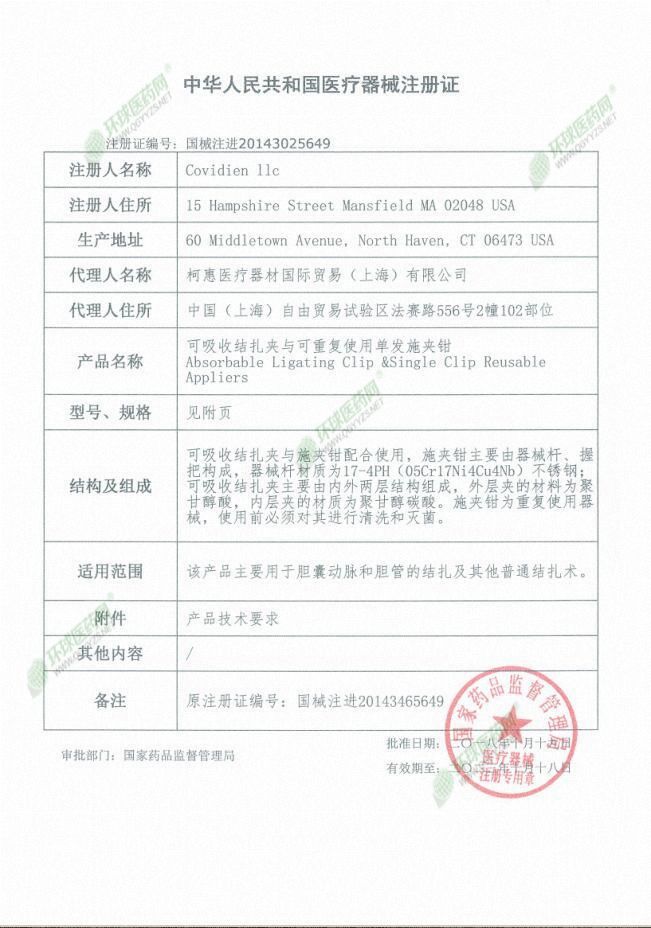 生產(chǎn)企業(yè): 柯惠醫(yī)療器材國際貿(mào)易(上海)有限公司