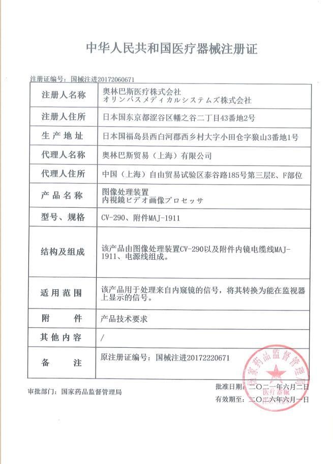 | 主要成分 | 該產(chǎn)品由圖像處理裝置CV-290以及附件內(nèi)鏡電纜線MAJ-1911、電源線組成。 |