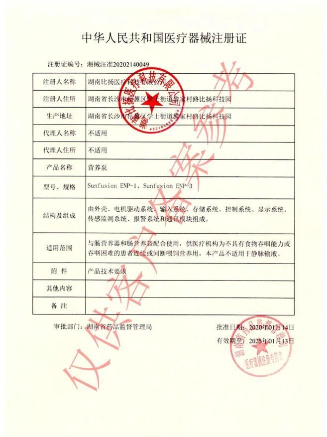| 補(bǔ)充說(shuō)明 | 產(chǎn)品介紹: 通過(guò)控制直流電機(jī)產(chǎn)生正壓推動(dòng),均勻、準(zhǔn)確地將營(yíng)養(yǎng)液輸入患者腸胃內(nèi),為不具有食物吞咽能力的患者連續(xù)或者間斷喂飼營(yíng)養(yǎng)、**患者攝入足夠的熱能、蛋白質(zhì)等多種營(yíng)養(yǎng)素,滿足其對(duì)營(yíng)養(yǎng)和治療的需要,促進(jìn)康復(fù)。 比揚(yáng)營(yíng)養(yǎng)泵 ENP-1 產(chǎn)品設(shè)計(jì): ●體積小,重量輕,運(yùn)轉(zhuǎn)便攜; ●全透明泵門設(shè)計(jì),營(yíng)養(yǎng)輸送清晰可見; ●多種工作模式:連續(xù)、間斷、反抽; ●3.5英寸高清大屏顯示,重要信息一目了然; ●觸摸屏+鍵盤雙控輸入,飛梭旋鈕設(shè)計(jì),簡(jiǎn)單易用; ●可拆卸電池倉(cāng),拆換方便。 |