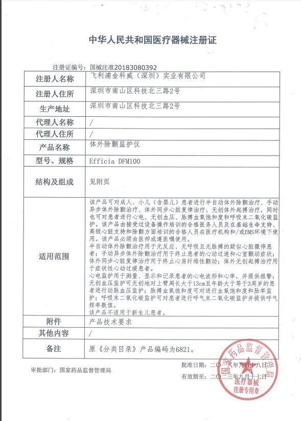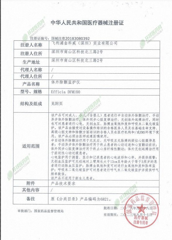 | 補(bǔ)充說(shuō)明 | 注冊(cè)證號(hào) 國(guó)械注準(zhǔn)20183080392 適用范圍 該產(chǎn)品可對(duì)成人、小兒(含嬰兒)患者進(jìn)行半自動(dòng)體外除顫治療、手動(dòng)異步體外除顫治療、體外同步心臟復(fù)律治療、無(wú)創(chuàng)體外起搏治療,同時(shí)也可對(duì)患者進(jìn)行心電、無(wú)創(chuàng)血壓、脈搏血氧飽和度和呼吸末二氧化碳監(jiān)護(hù)。該產(chǎn)品由接受過(guò)設(shè)備操作培訓(xùn)的合格醫(yī)務(wù)人員及在基礎(chǔ)生命支持、高級(jí)心臟支持和除顫方面培訓(xùn)的合格人員在醫(yī)療機(jī)構(gòu)和/或EMS環(huán)境下使用。該產(chǎn)品必須由醫(yī)師或遵醫(yī)囑使用。 半自動(dòng)體外除顫治療用于無(wú)反應(yīng)、無(wú)呼吸且無(wú)脈搏的疑似心臟驟;颊撸皇謩(dòng)異步體外除顫治療用于終止患者的心動(dòng)過(guò)速和心室顫動(dòng)癥狀;體外同步心臟復(fù)律治療用于終止心房纖維性顫動(dòng);體外無(wú)創(chuàng)起搏治療用于癥狀性心動(dòng)過(guò)緩患者。 心電監(jiān)護(hù)用于測(cè)量、顯示和記錄患者的心電波形和心率,并提供報(bào)警;無(wú)創(chuàng)血壓監(jiān)護(hù)可無(wú)創(chuàng)地對(duì)上臂周長(zhǎng)大于13cm且年齡大于等于3周歲的患者進(jìn)行動(dòng)脈血壓監(jiān)護(hù);脈搏血氧飽和度可對(duì)進(jìn)行血氧飽和度和脈率監(jiān)護(hù);呼吸末二氧化碳監(jiān)護(hù)可對(duì)患者進(jìn)行呼氣末二氧化碳監(jiān)護(hù)并提供呼氣頻率數(shù)值。 該產(chǎn)品不適用于新生兒患者。 |
