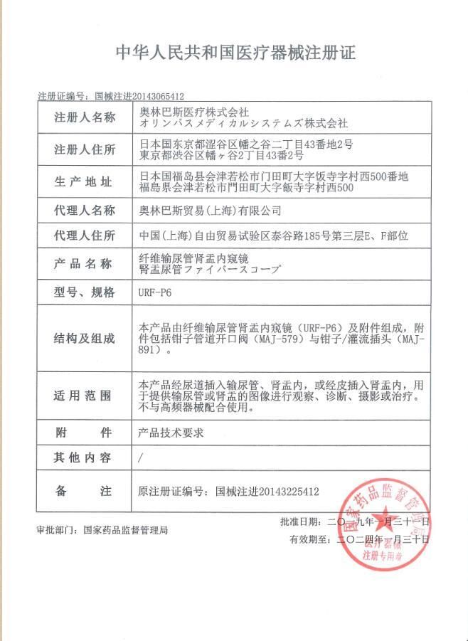 | 產(chǎn)品用途 | 本產(chǎn)品經(jīng)尿道插入輸尿管、腎盂內(nèi),或經(jīng)皮插入腎盂內(nèi),用于提供輸尿管或腎盂的圖像進行觀察、診斷、攝影或治療。不與高頻器械配合使用。 |