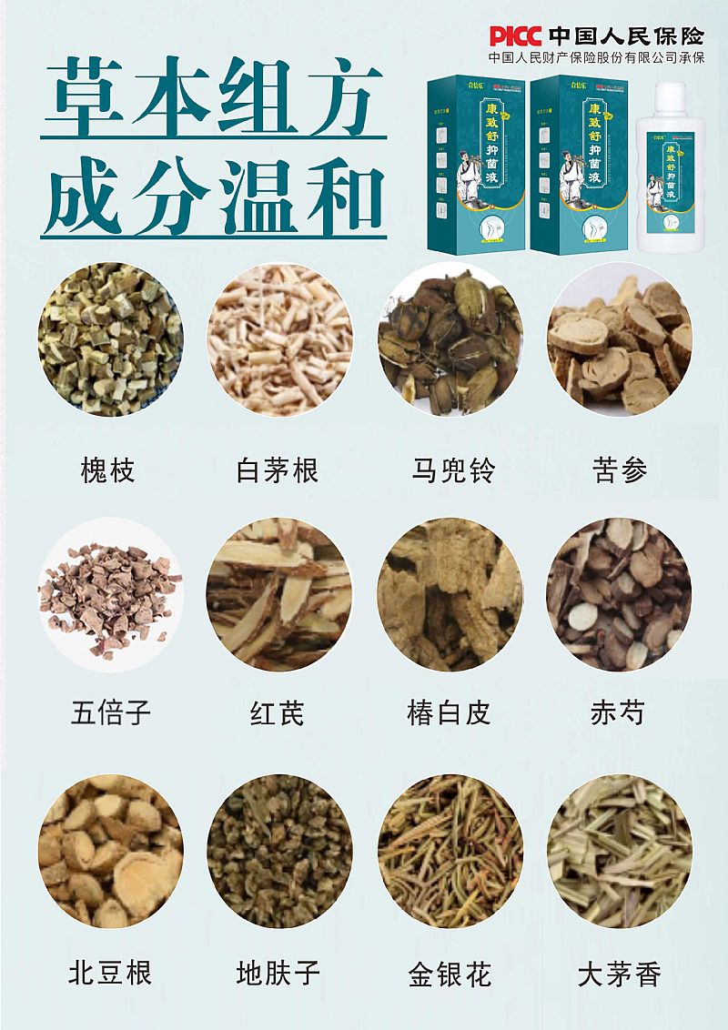| 主要成分 | 槐枝提取物、白茅根提取物、五倍子提取物、苦參提取物、馬兜鈴提取物、紅芪提取物、椿白皮提取物、赤芍提取物、北豆根提取物、地膚子提取物、黃柏提取物、金銀花提取物、大茅香提取物。 |