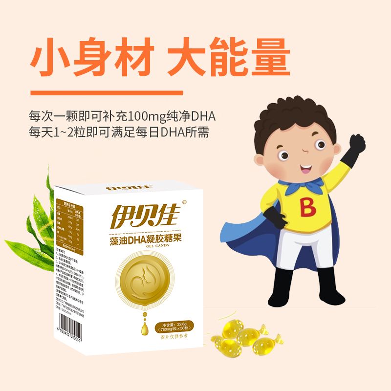 | 補(bǔ)充說明 | .[注意事項] 1、兒童需在成人監(jiān)護(hù)下食用; 2、本品為普通食品; 3、DHA藻油為新資源食品,DHA藻油推薦食用量≤300mg/天( 以純DHA計)。根據(jù)本產(chǎn)品添加量食用量不得超過3粒/天; 4、本品貯存溫度≥35°C時有可能致使產(chǎn)品變形或部分溶解;膠皮顏色受熱和儲存環(huán)境影響變深,此為明膠特性,不影響產(chǎn)品質(zhì)量。 伊貝佳 藻油DHA凝膠糖果采用植物性海藻油提取,更安心。 |