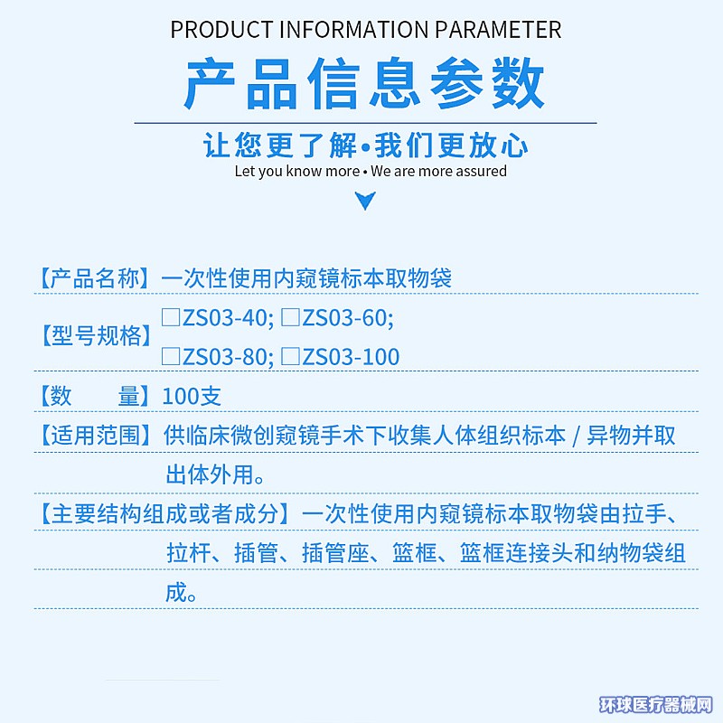 | 補充說明 | 【規(guī)格型號】□ZS03-40;□ZS03-60;□ZS03-80;□ZS03-100 【主要結(jié)構(gòu)組成】由拉手、拉桿、插管、插管座、籃框、籃框連接頭和納物袋組成。 【適用范圍】供臨床微創(chuàng)窺鏡手術(shù)下收集人體組織標本/異物并取出體外用。 【產(chǎn)品性能】一次性使用內(nèi)窺鏡標本取物袋的浸出液和空白液消耗高錳酸鉀溶液[c(1/5KMnO4)=0.01mol/L]的體積之差不超過1.5mL;一次性使用內(nèi)窺鏡標本取物袋的浸出液的重金屬總含量≤1×10-5g/mL;環(huán)氧乙烷殘留量應不大于10μg/g;一次性使用內(nèi)窺鏡標本取物袋應無菌。 【注意事項、警示】1.本產(chǎn)品采用環(huán)氧乙烷滅菌,滅菌有效期為二年,嚴禁超期使用;2.僅供一次性使用,用后銷毀;3.單包裝袋破損,嚴禁使用;4.本產(chǎn)品由專業(yè)醫(yī)護人員使用。 |