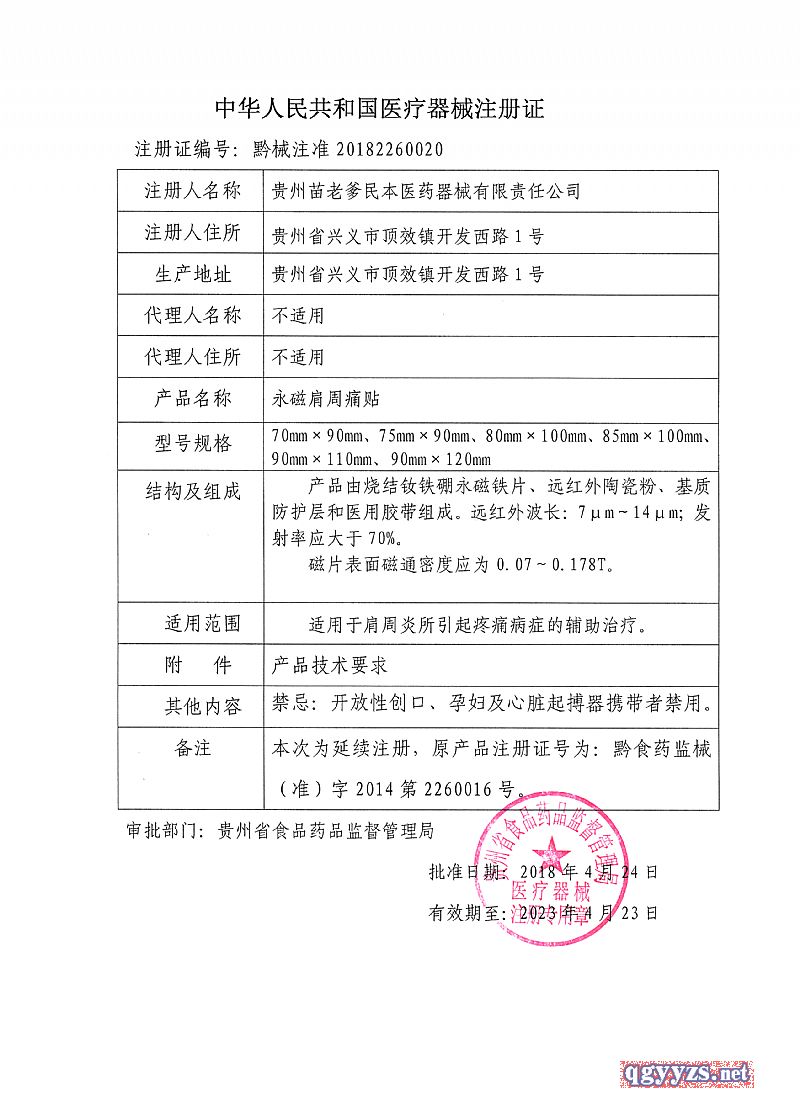 | 補(bǔ)充說(shuō)明 | 1、使用本品,若個(gè)別皮膚出現(xiàn)瘙癢或皮疹,應(yīng)立即停止使用即可。 2、使用或存放本品時(shí)應(yīng)遠(yuǎn)離磁卡和易受磁損壞物品;不要與帶金屬儀表的器械同時(shí)使用。 3、開(kāi)放性傷口、孕婦、兒童、心臟起搏器攜帶者和對(duì)磁療有明顯不良反應(yīng)者禁用。 4、置于干燥通風(fēng)處保存。 【售后服務(wù)單位】貴州苗老爹民本醫(yī)藥器械有限責(zé)任公司 【注冊(cè)人住所】貴州省興義市頂效鎮(zhèn)開(kāi)發(fā)西路1號(hào) |