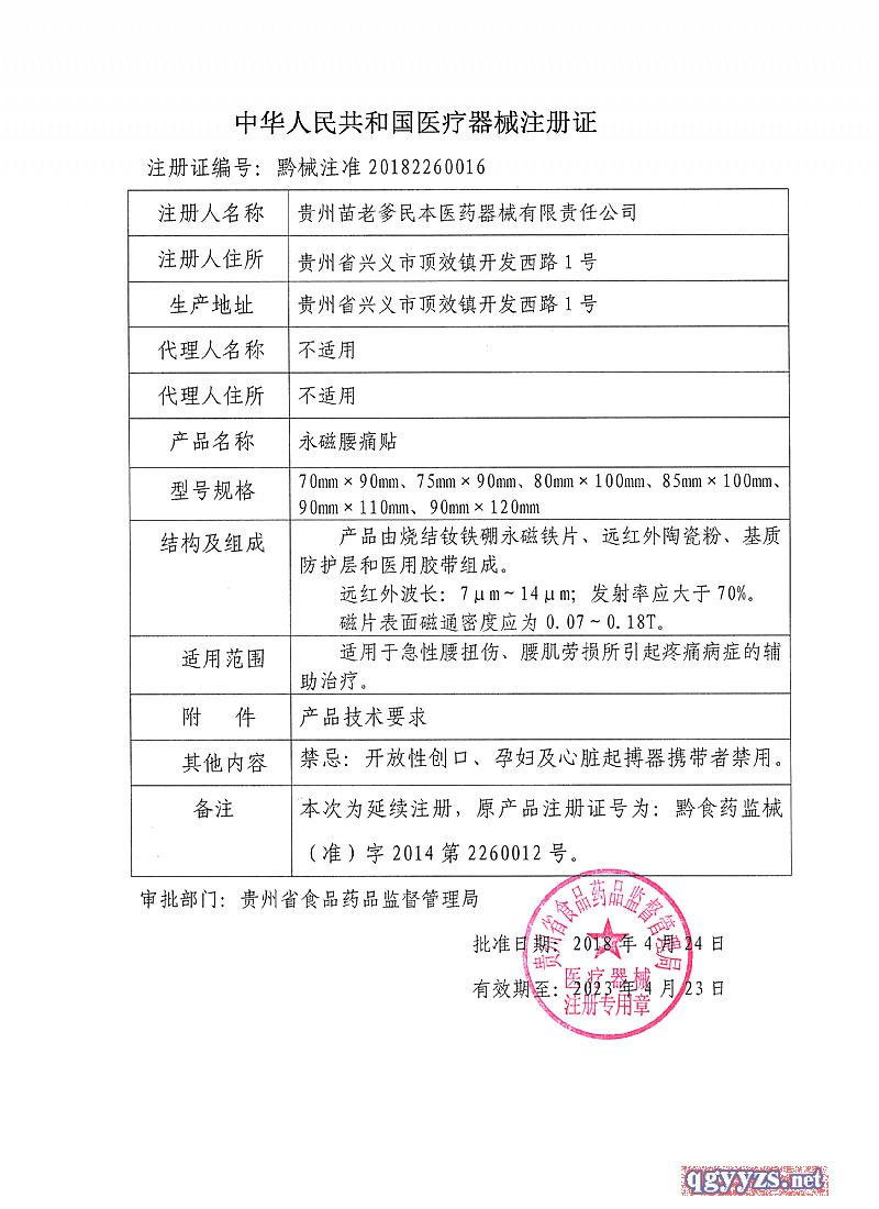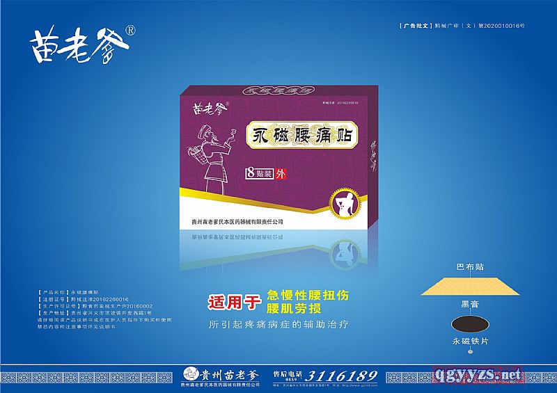 | 補(bǔ)充說明 | 1、使用本品,若個(gè)別皮膚出現(xiàn)瘙癢或皮疹,應(yīng)立即停止使用即可。 2、使用或存放本品時(shí)應(yīng)遠(yuǎn)離磁卡和易受磁損壞物品;不要與帶金屬儀表的器械同時(shí)使用。 3、開放性傷口、孕婦、兒童、心臟起搏器攜帶者和對磁療有明顯不良反應(yīng)者禁用。 4、置于干燥通風(fēng)處保存。 【售后服務(wù)單位】貴州苗老爹民本醫(yī)藥器械有限責(zé)任公司 【注冊人住所】貴州省興義市頂效鎮(zhèn)開發(fā)西路1號 |