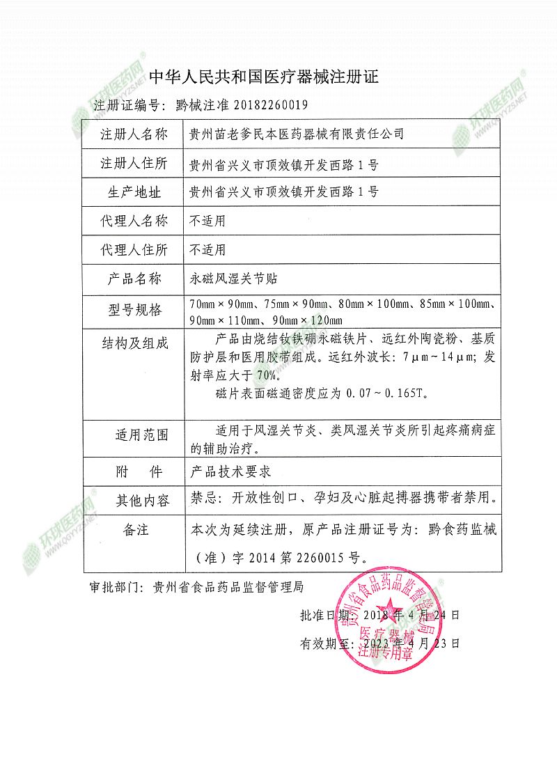| 補充說明 | 1、使用本品,若個別皮膚出現(xiàn)瘙癢或皮疹,應(yīng)立即停止使用即可。 2、使用或存放本品時應(yīng)遠(yuǎn)離磁卡和易受磁損壞物品;不要與帶金屬儀表的器械同時使用。 3、開放性傷口、孕婦、兒童、心臟起搏器攜帶者和對磁療有明顯不良反應(yīng)者禁用。 4、置于干燥通風(fēng)處保存。 【售后服務(wù)單位】貴州苗老爹民本醫(yī)藥器械有限責(zé)任公司 【注冊人住所】貴州省興義市頂效鎮(zhèn)開發(fā)西路1號 |